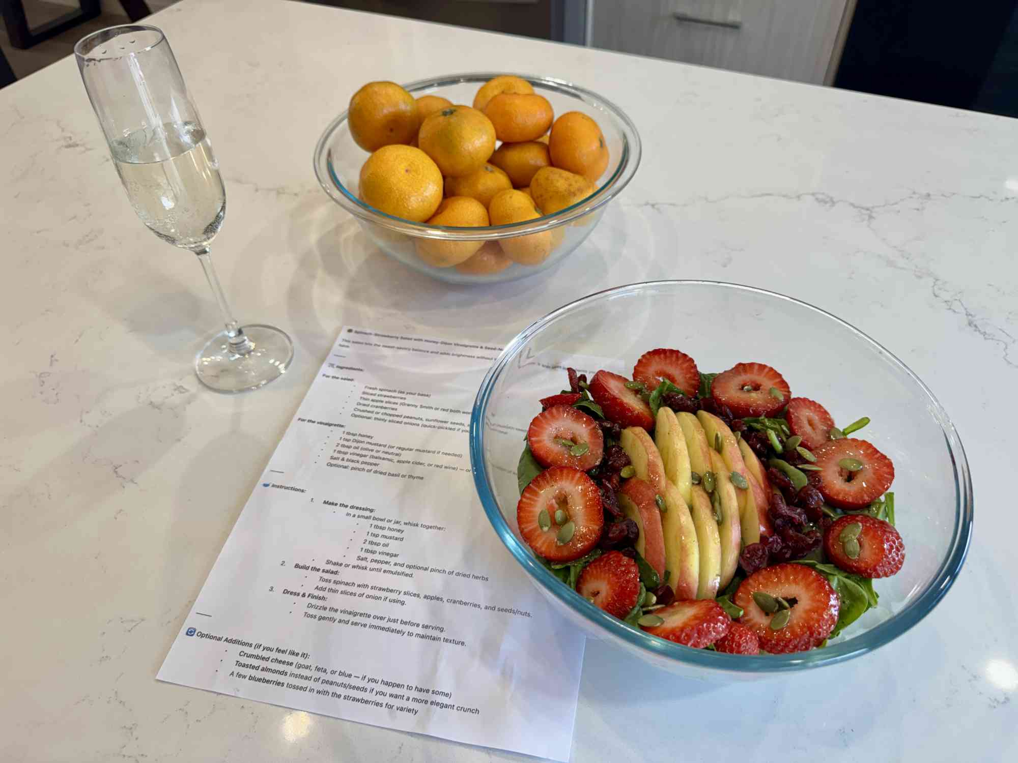 - Build the salad: Toss spinach with strawberry slices, apples, cranberries, and seeds/nuts. Add thin slices of onion if using.